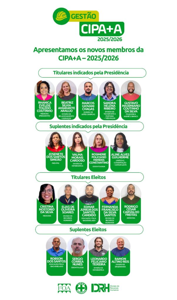Com uma equipe motivada, apoio institucional consolidado e diretrizes claras, a CIPA+A inicia sua gestão com o compromisso de promover ambientes de trabalho e estudo cada vez mais seguros, saudáveis e humanos em sintonia com a missão educacional, assistencial e social da FOA/UniFOA.